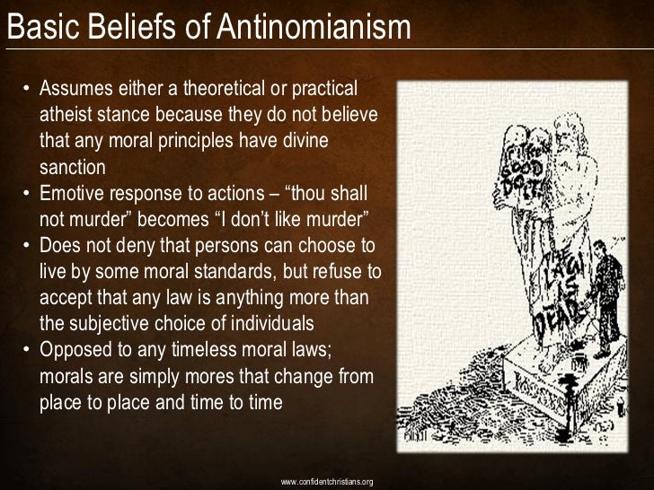 Antinomian is defined as "One who holds that under the Gospel dispention of Grace, the moral law is of no use or obligation because faith alone is neccessary for Salvation." Or, "One who rejects a socially established morality.